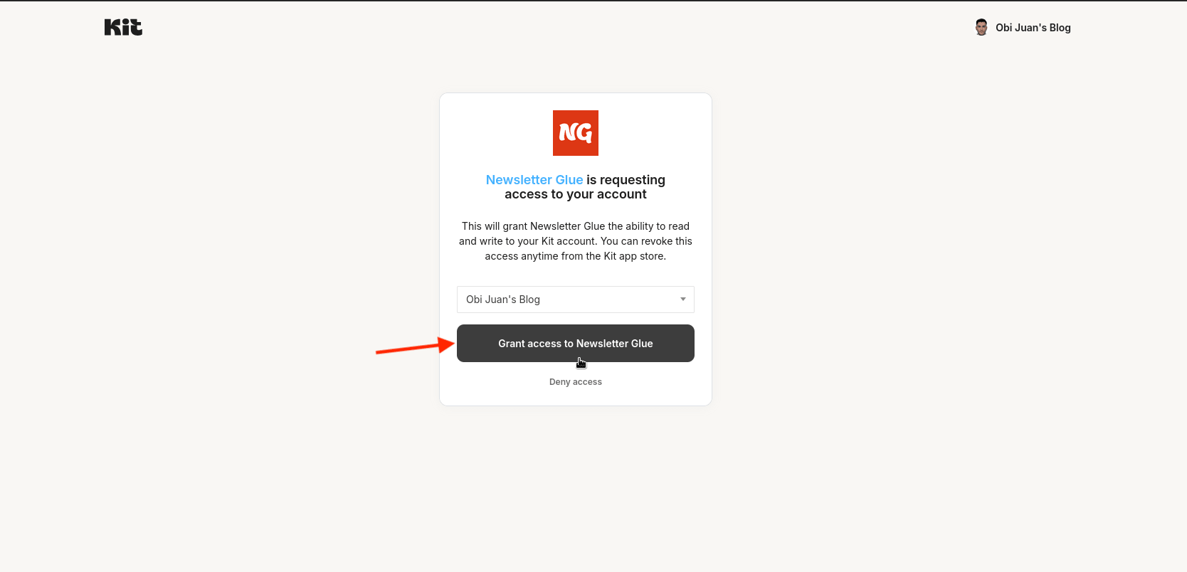 3. Select the desired Kit account and click Grant access to Newsletter Glue.