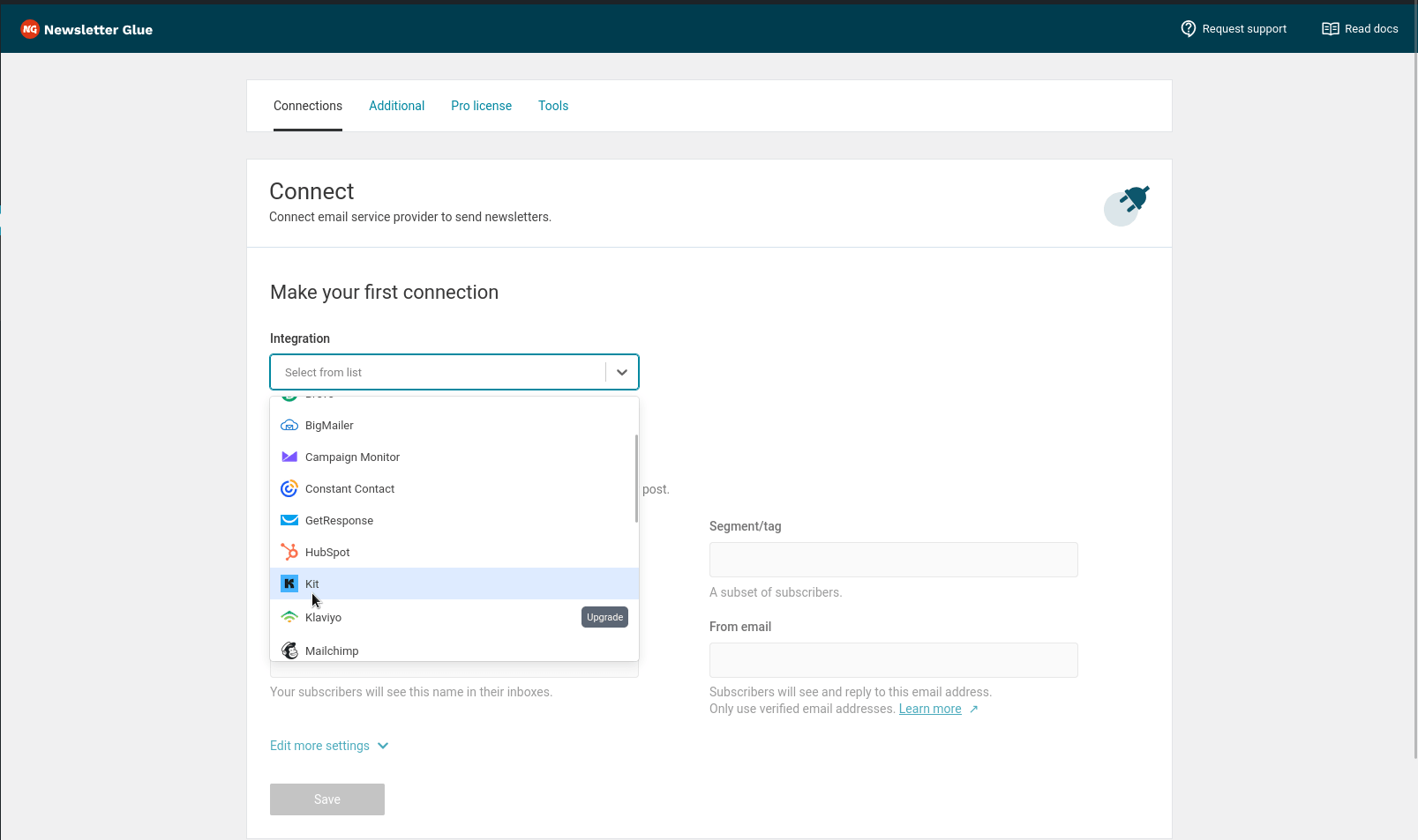 After activating the Newsletter Glue plugin, you’ll be taken to our onboarding wizard. Enter your license key to activate your license. Then, connect your email service provider.