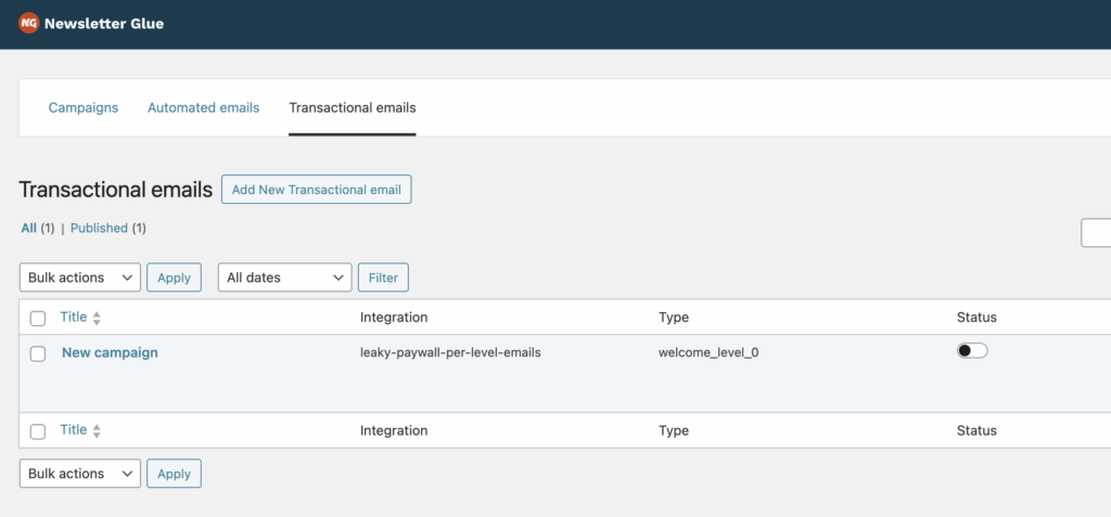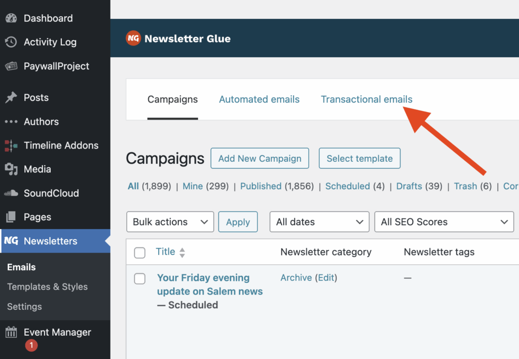 To create transactional emails for Leaky Paywall using Newsletter Glue, go to Newsletters -> Emails -> Transactional email.