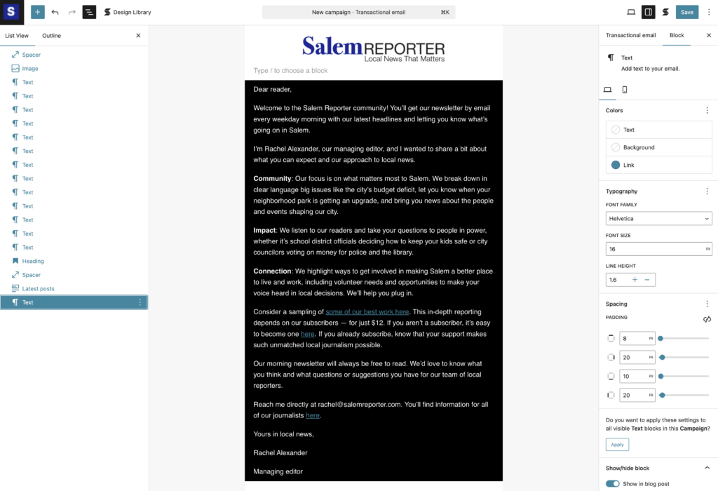 That’s it! Your new Newsletter Glue-designed transactional email for Leaky Paywall is now live. Whenever a new subscriber signs up, they’ll receive your new Newsletter Glue email which overrides the default message from Leaky Paywall.